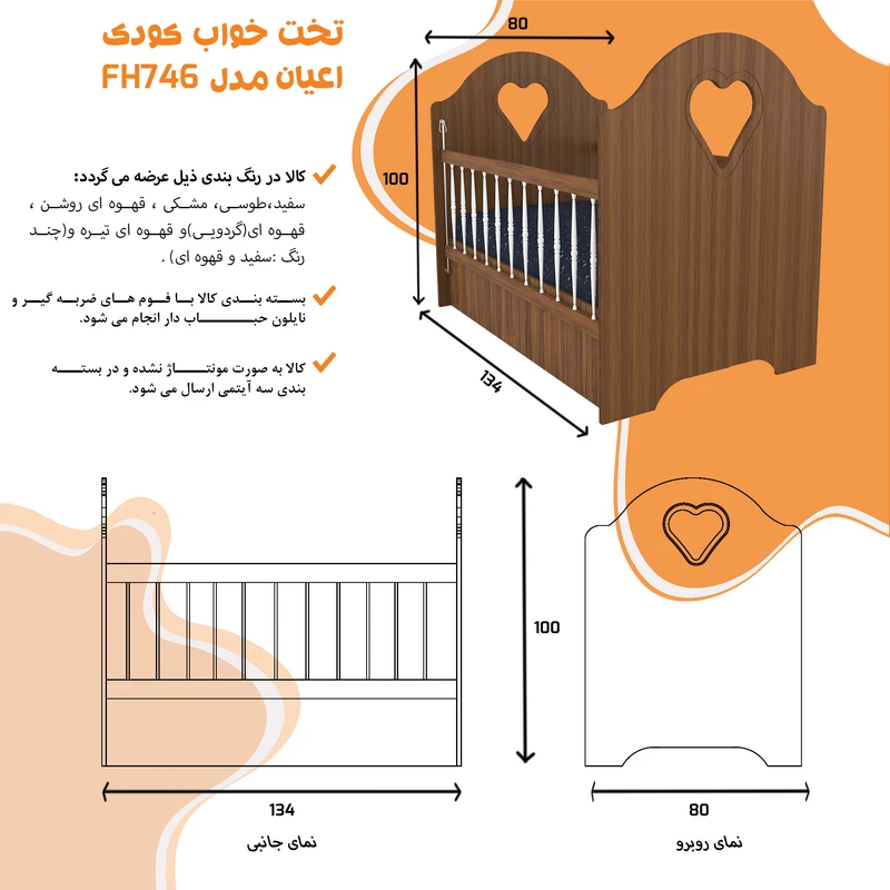 تختخواب کودک اعیان مدل FH746جنس کلگی بالا و پایین تخت خواب مغزی ام دی اف با روکش وکیوم می باشد-جنس بغل تخت ها و قیدهای تختخواب مغزی نئوپان با روکش ملامینه شرکتی است و کفی تختخواب یک تکه و نئوپان است-نرده های تخت خواب از نوع خراطی و به صورت pvc هستند-این محصول دارای سی ان سی طرح قلب روی کلگی ها می باشد-لطفا توجه داشته باشید که همواره چند درجه اختلاف رنگ بین تصاویر بارگذاری شده و کالای ساخته شده وجود دارد-مناسب تشک 130×70-تشک همراه محصول ارائه نمی شود-کالا به صورت مونتاژ نشده ارسال می شود
