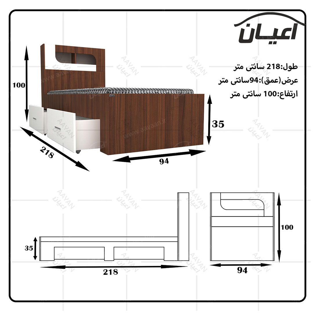 تخت خواب یکنفره اعیان مدل FH524 سایز 90×200 سانتی مترمشخصات تخت خواب |