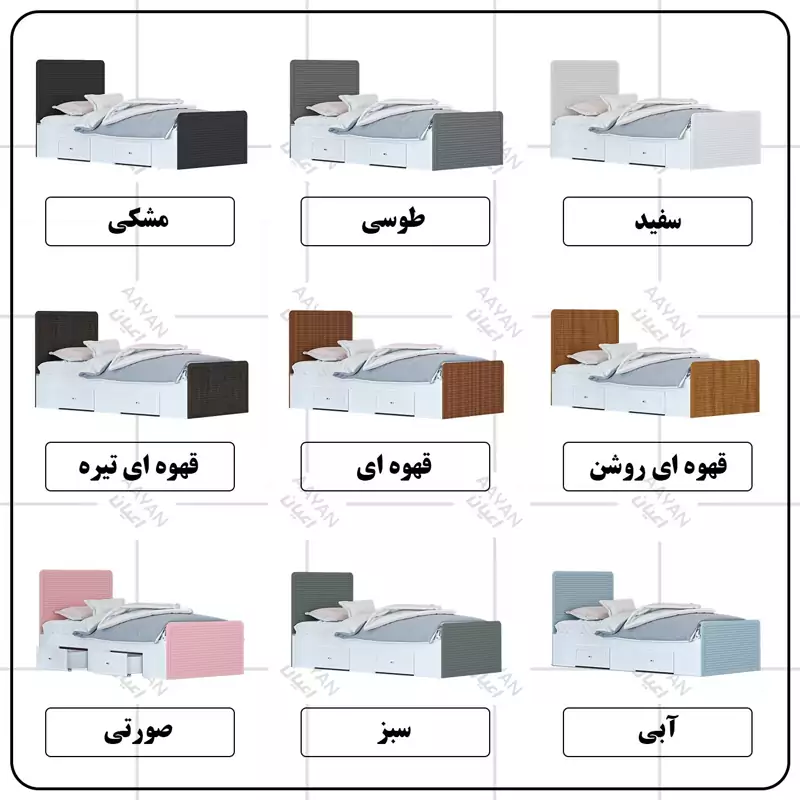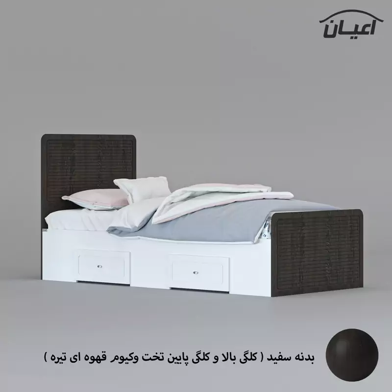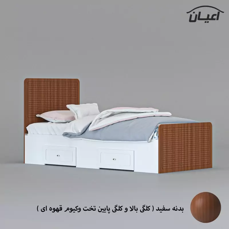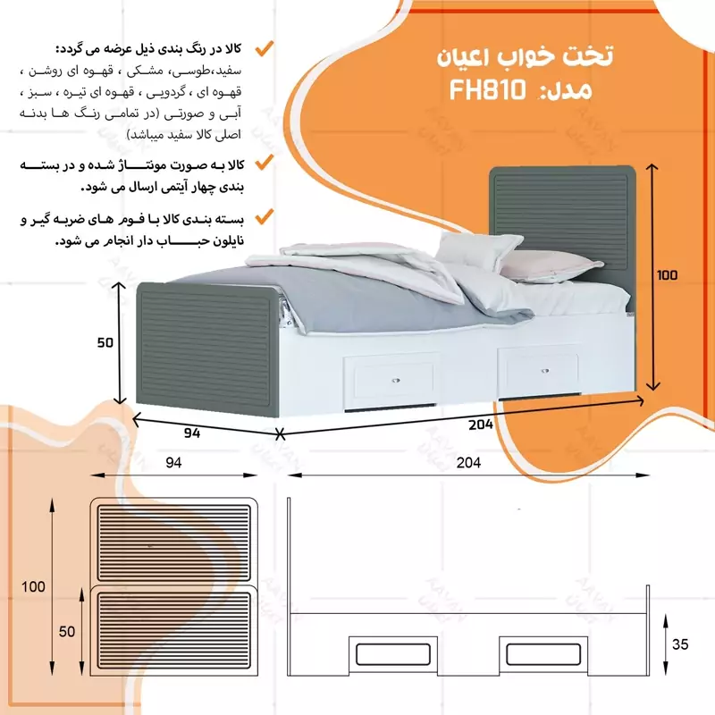 تخت خواب یکنفره اعیان مدل FH810جنس بدنه (بغل تخت ها) مغزی نئوپان با روکش ملامینه-جنس کلگی بالا و پایین و درب کشو ها مغزی ام دی اف با روکش وکیوم شرکتی و دارای طرح سی ان سی است-همچنین دارای دو کشو با چرخ ساکی بوده که قابلیت جابجایی دارند-کفی کار نئوپان بوده و همراه با چند جفت پایه متحرک ارسال می گردد-مناسب تشک 200×90-تشک همراه محصول ارائه نمی شود-کالا به صورت مونتاژ نشده ارسال می شود.