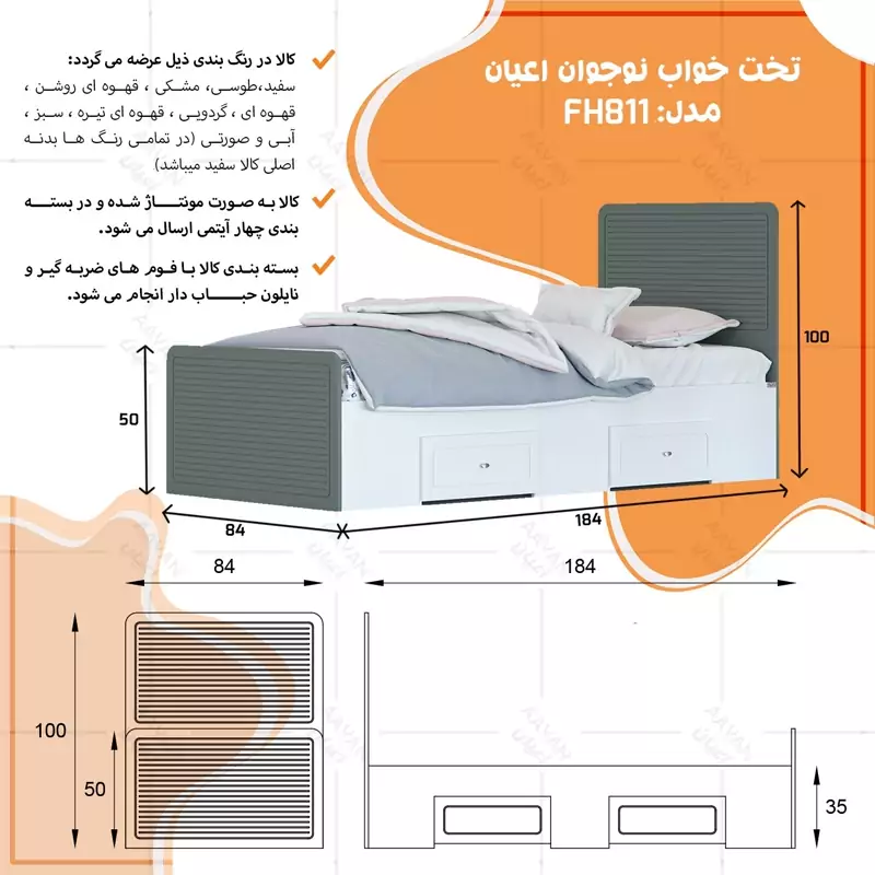 • سایر توضیحات : تشک همراه محصول ارائه نمی شود، کالا به صورت مونتاژ نشده ارسال می شود, طراحی ساده و کاربردی، وزن متناسب با ابعاد، تحمل وزن متناسب با ابعاد و به صورت استاندارد