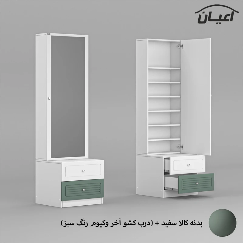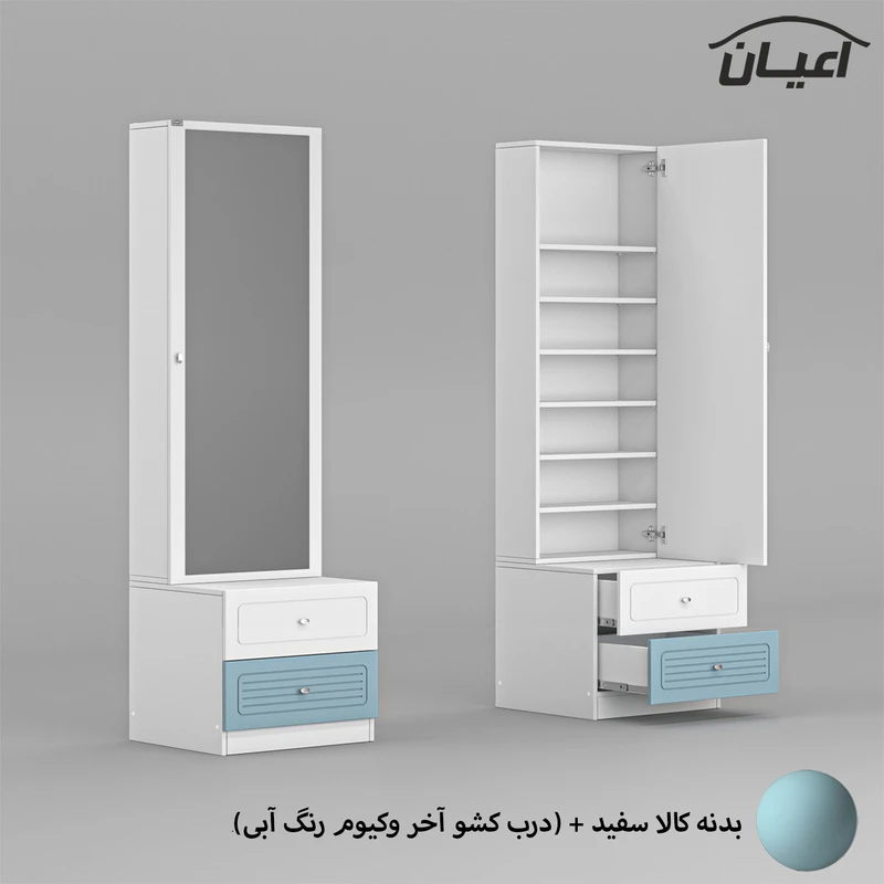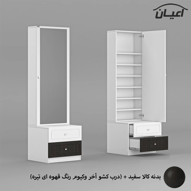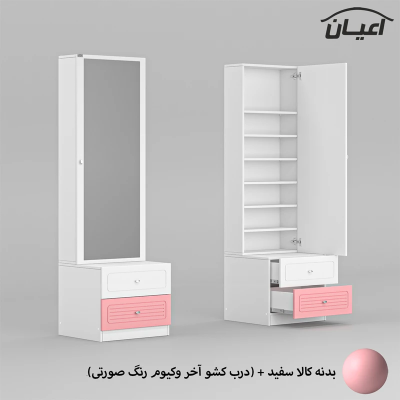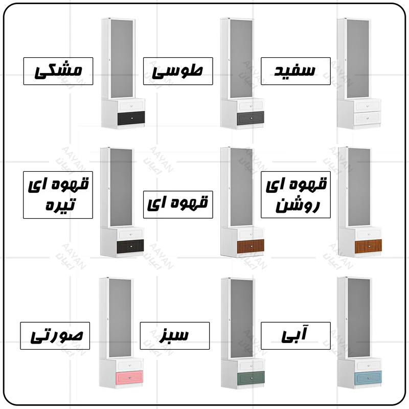 • سایر توضیحات : 2 کشو باز شو شامل ریل سه تکه, دارای 6 طبقه و 7 فضای مجزا برای قرار دادن لوازم آرایشی, دارای آینه, دستگیره های استیل تک پیچ, طراحی ساده و کاربردی، وزن و تحمل وزن متناسب با ابعاد به صورت استاندارد، کالا به صورت مونتاژ شده, نوار پی وی سی