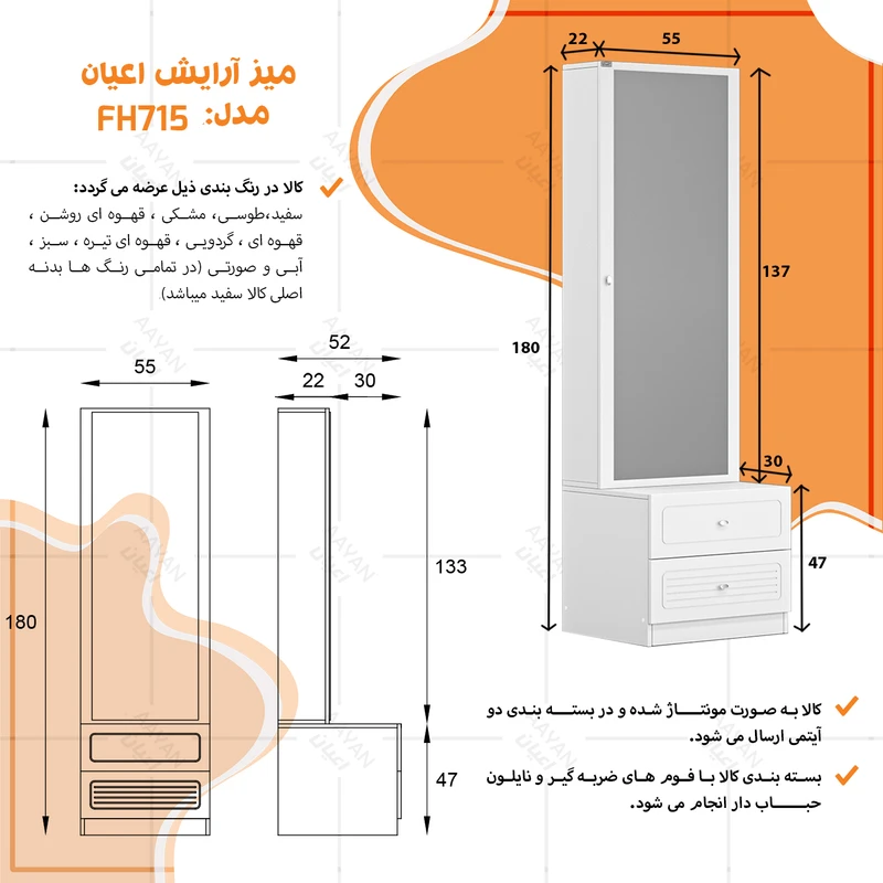 ست میز آرایش اعیان به صورت دوتکه می باشد :(که شامل یک میز با دو کشو-کشوها دارای ریل سه تکه می باشد-جنس درب کشوها: مغزی ام دی اف با روکش وکیوم می باشد و یک باکس (استند) کمدی دارای شش طبقه و هفت فضای مجزا برای قرار دادن لوازم آرایشی به همراه آینه و دستگیره های استیل تک پیچ-سطح ضدخش-طراحی ساده و کاربردی-وزن متناسب با ابعاد-تحمل وزن متناسب با ابعاد و به صورت استاندارد-دارای نوار پی وی سی-کالا به صورت مونتاژ شده ارسال می شود-بسته بندی کالا به صورت دو آیتمی است