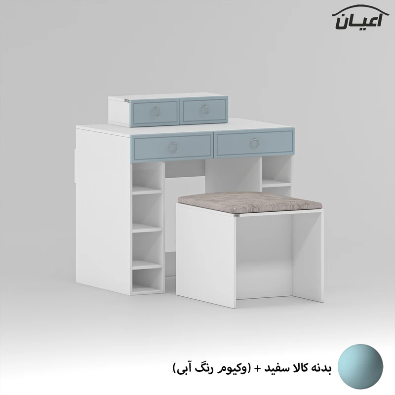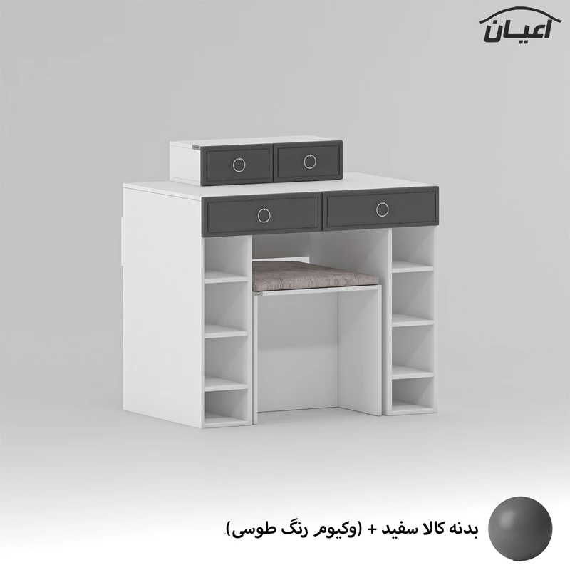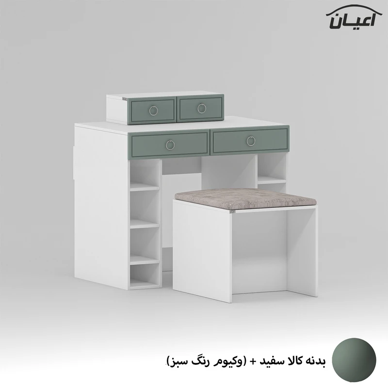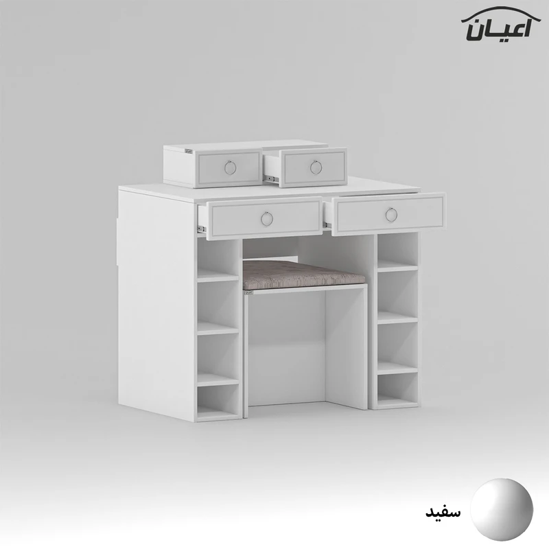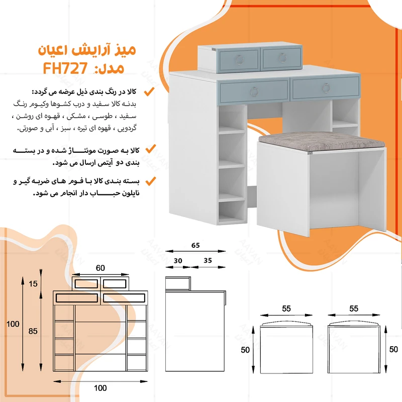ست میز آرایش اعیان-دارای صندلی- جنس بدنه مغزی نئوپان با روکش ملامینه-جنس درب مغزی ام دی اف با روکش وکیوم- جنس صندلی نئوپان ملامینه و دارای نشیمن لمسه با پارچه مبلی کرمی رنگ است–دارای چهار کشو بازشو با ریل سه تکه-دستگیره گوشواره ای استیل-در قسمت پایه های میز دارای شش طبقه و شش فضا-رنگبندی(سفید-طوسی- مشکی-قهوه ای روشن-قهوه ای(گردویی)-قهوه ای تیره-آبی – صورتی و سبز( دقت داشته باشید بدنه سفید و درب کشو ها رنگی می باشد)-کالا به صورت مونتاژ شده در دو آیتم بسته بندی و ارسال می شود