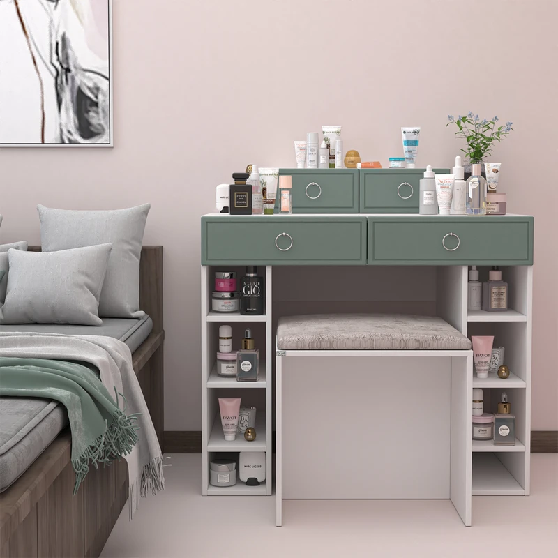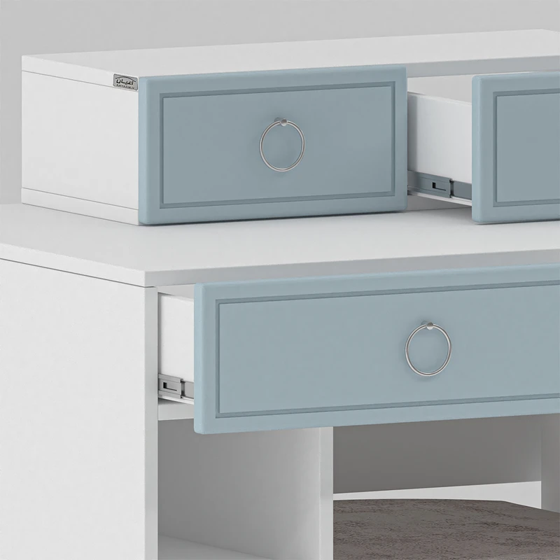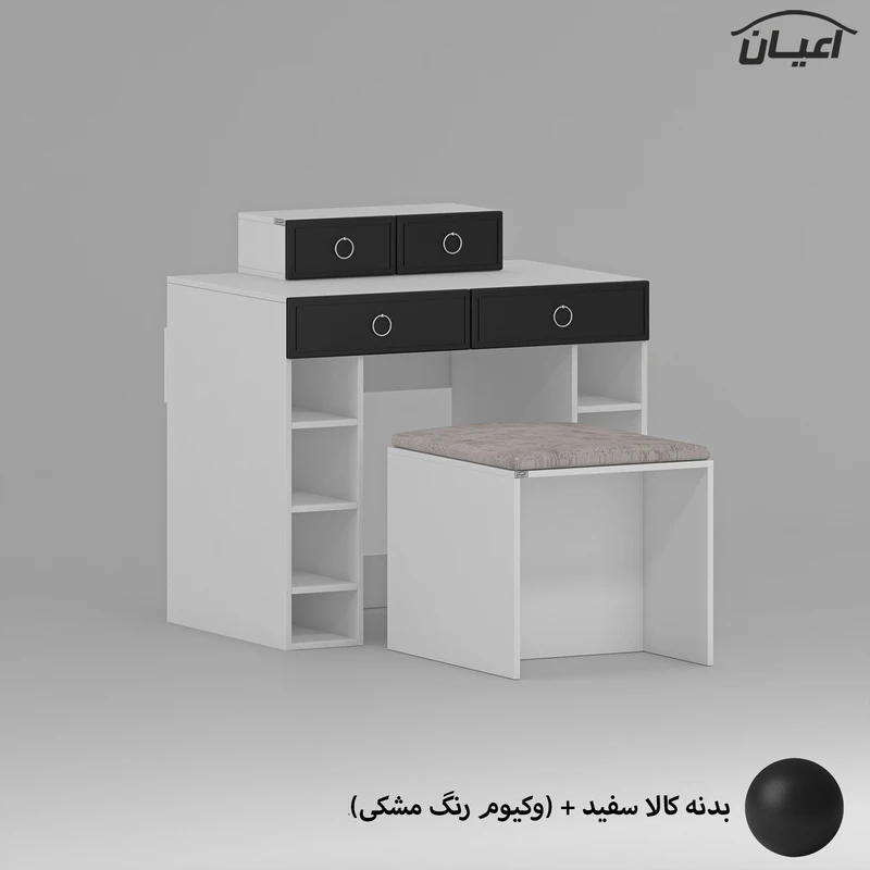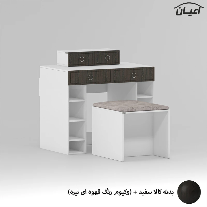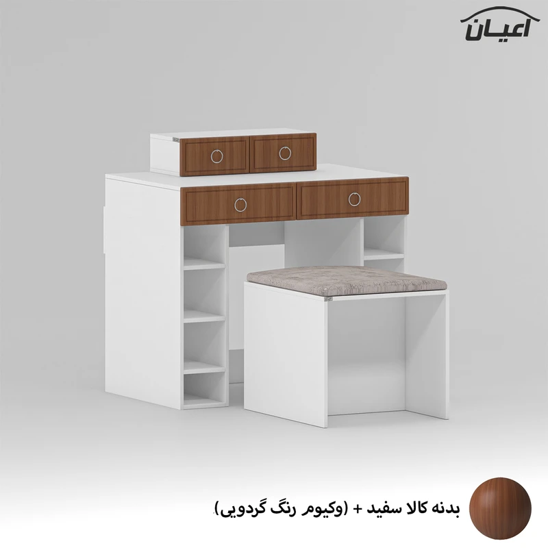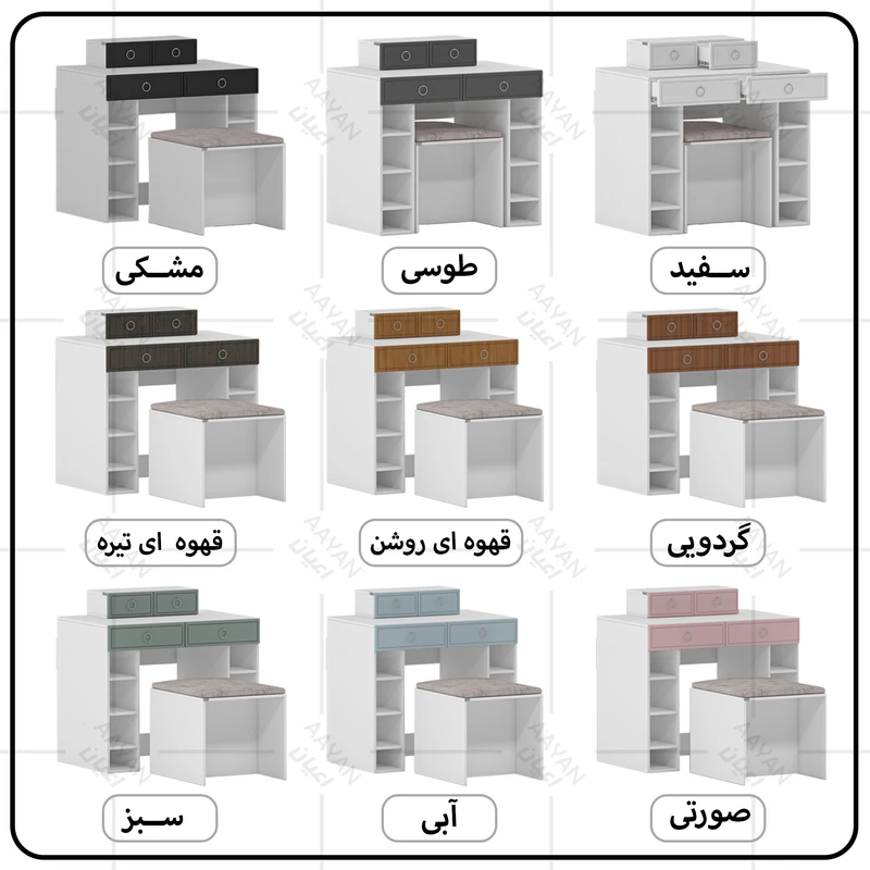 ست میز آرایش اعیان-دارای صندلی- جنس بدنه مغزی نئوپان با روکش ملامینه-جنس درب مغزی ام دی اف با روکش وکیوم- جنس صندلی نئوپان ملامینه و دارای نشیمن لمسه با پارچه مبلی کرمی رنگ است–دارای چهار کشو بازشو با ریل سه تکه-دستگیره گوشواره ای استیل-در قسمت پایه های میز دارای شش طبقه و شش فضا-رنگبندی(سفید-طوسی- مشکی-قهوه ای روشن-قهوه ای(گردویی)-قهوه ای تیره-آبی – صورتی و سبز( دقت داشته باشید بدنه سفید و درب کشو ها رنگی می باشد)-کالا به صورت مونتاژ شده در دو آیتم بسته بندی و ارسال می شود