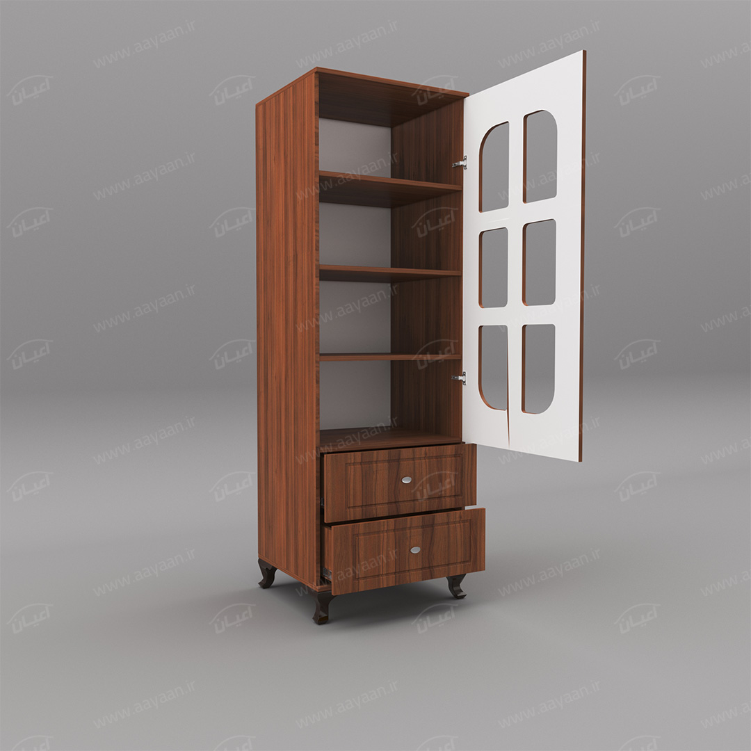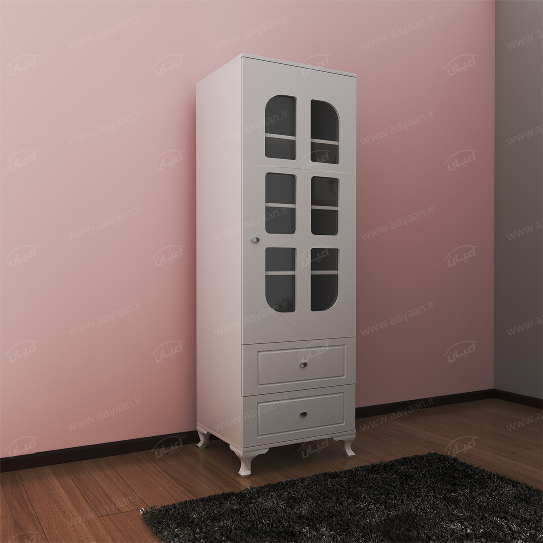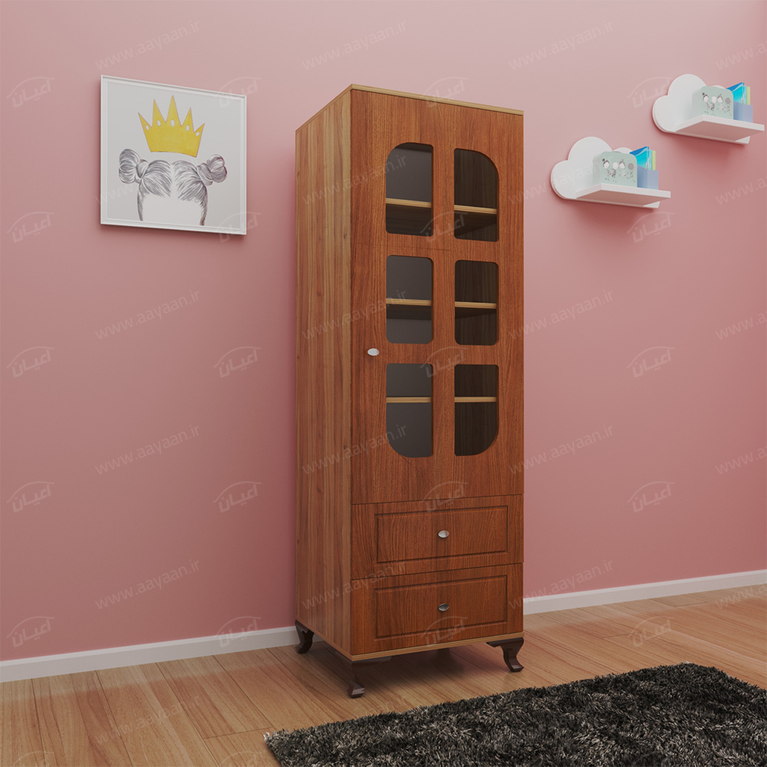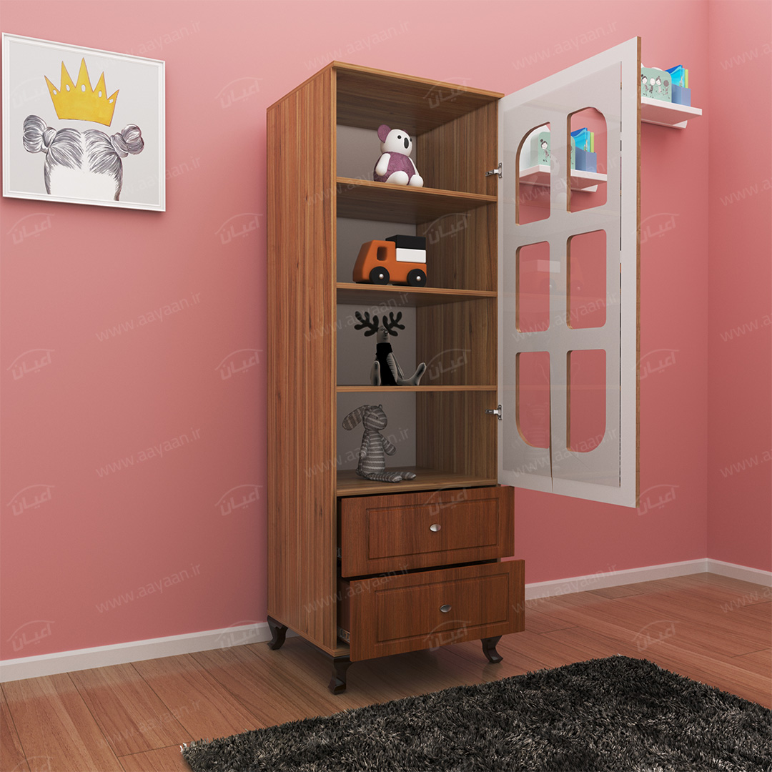 کمد لباس اعیان مدل FH456بسیار کاربردی و جادار-دو کشوی بازشو با ریل های سه تکه-دارای یک درب کمدی با شیشه در بخش ویترین و لولای آرامبند-دارای سه طبقه و چهار فضا-دستگیره ها به صورت استیل تک پیچ-بسته بندی کالا به صورت تک آیتمی است-کالا به صورت مونتاژ شده ارسال می شود