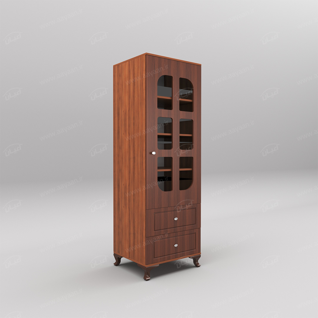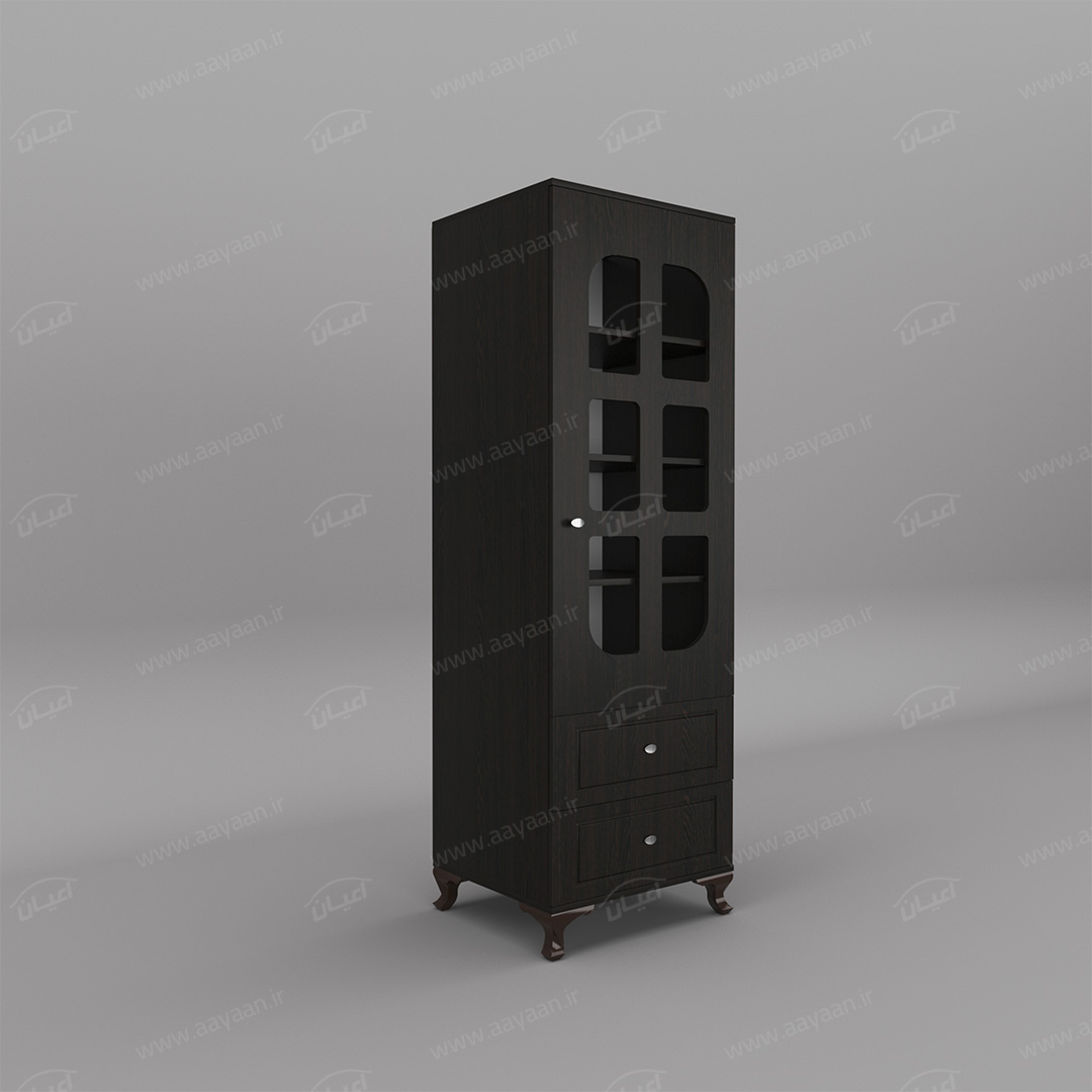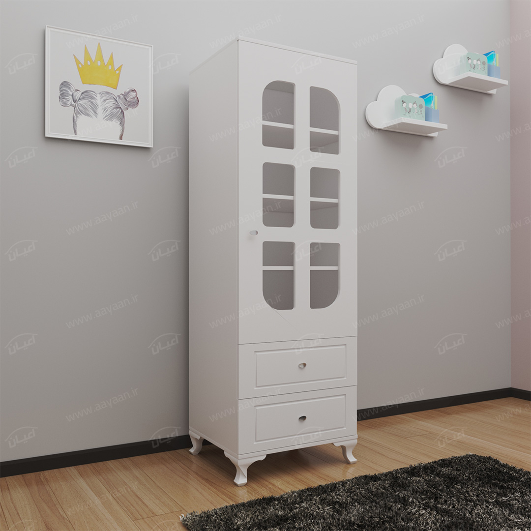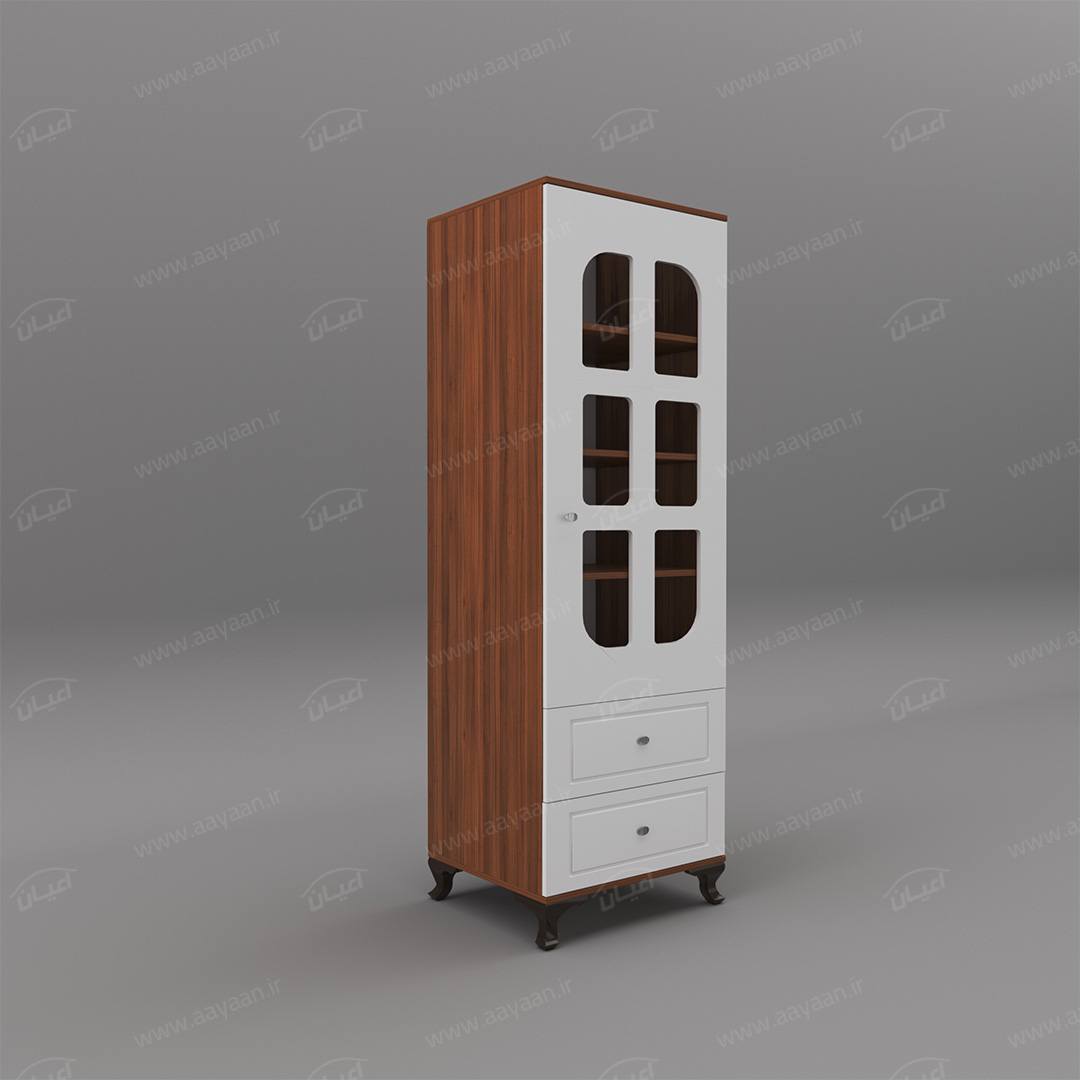کمد لباس اعیان مدل FH456بسیار کاربردی و جادار-دو کشوی بازشو با ریل های سه تکه-دارای یک درب کمدی با شیشه در بخش ویترین و لولای آرامبند-دارای سه طبقه و چهار فضا-دستگیره ها به صورت استیل تک پیچ-بسته بندی کالا به صورت تک آیتمی است-کالا به صورت مونتاژ شده ارسال می شود
