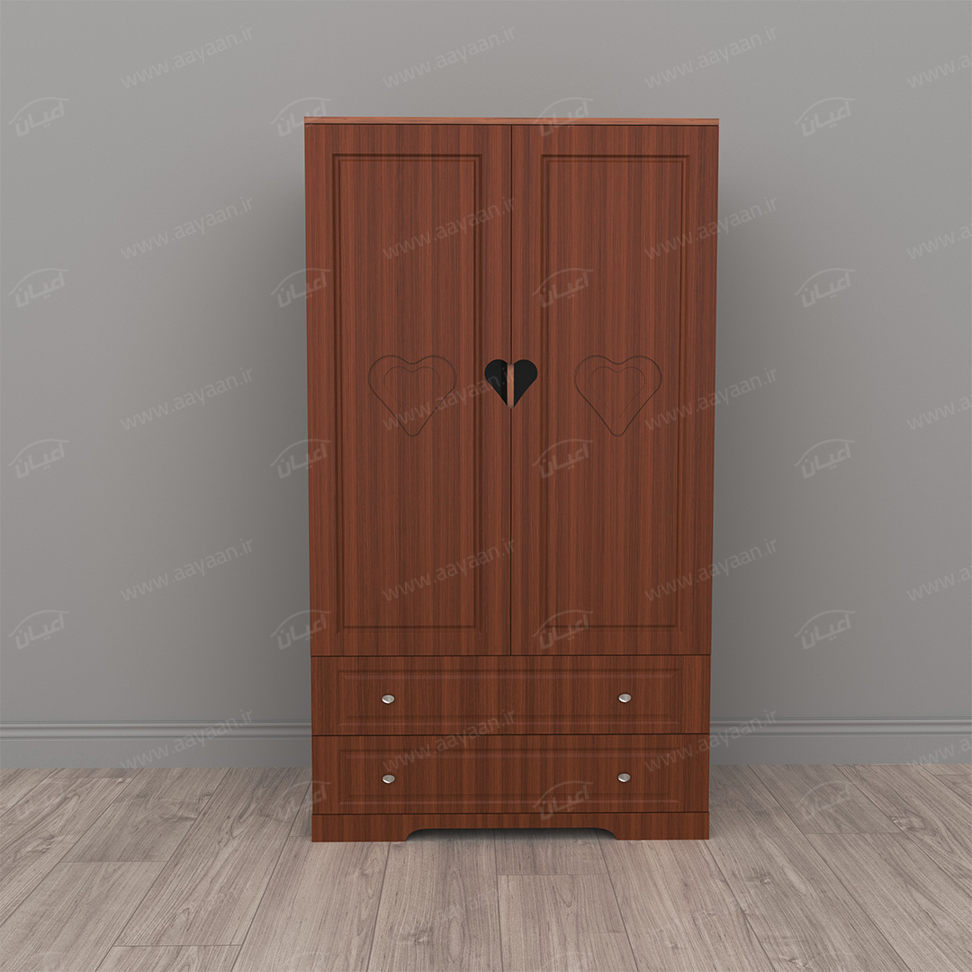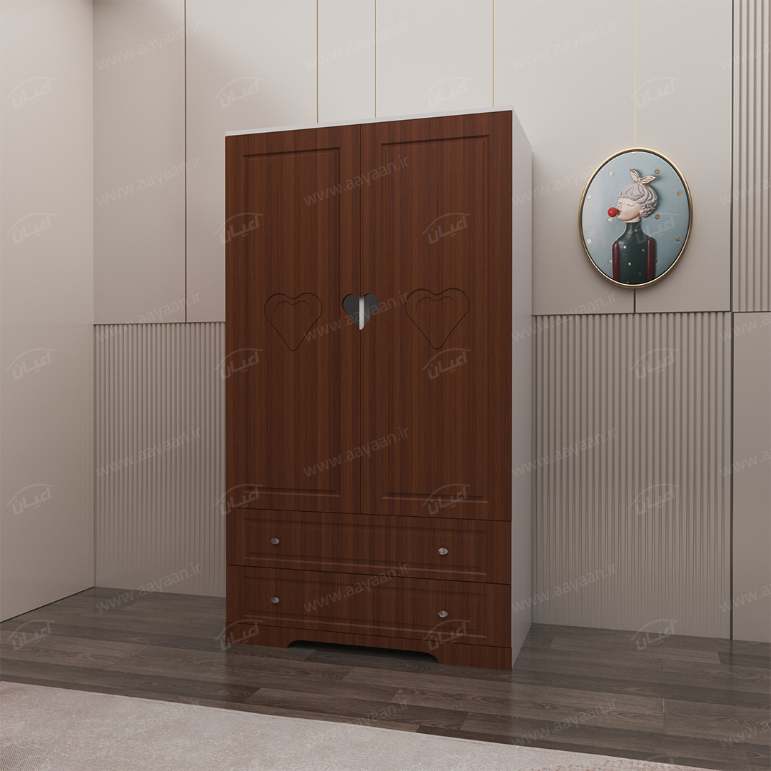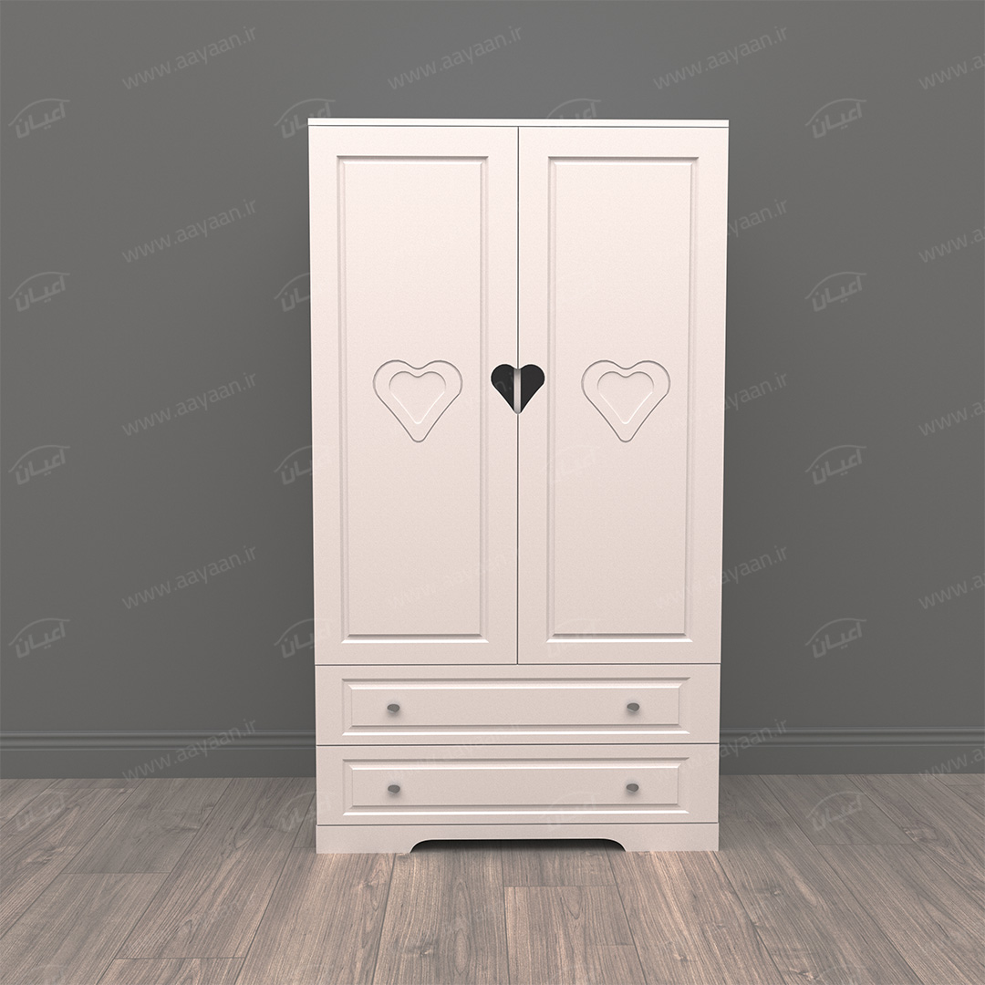 کمد لباس اعیان مدل FH471 طرح فانتزیکمد لباس اعیان-جنس نئوپان ملامینه و وکیوم(MDF روکش PVC)-بسیار کاربردی و جادار-دارای دو درب کمدی و دو فضای آویز لباس.دارای دو کشو با ریل سه تکه – بر روی درب ها طرح قلب به صورت حکاکی وجود دارد-ارسال در بسته بندی با برند و لوگو اعیان.