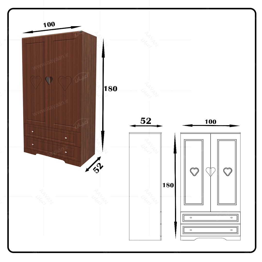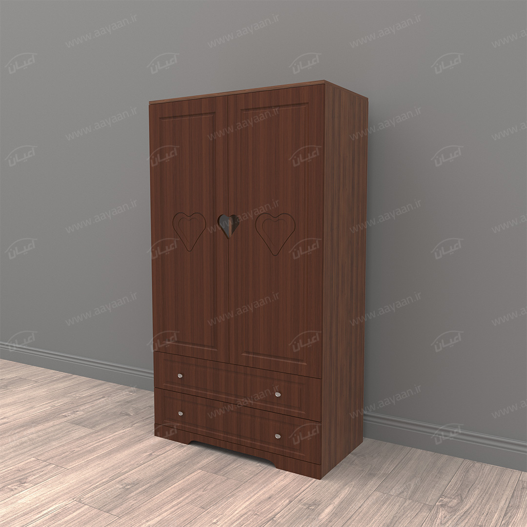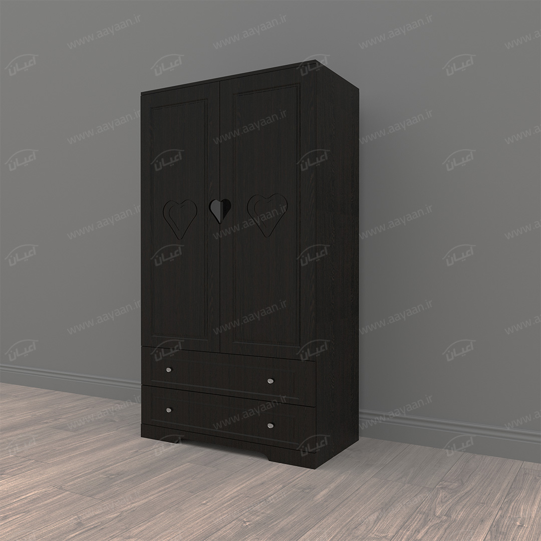 کمد لباس اعیان مدل FH471 طرح فانتزیکمد لباس اعیان-جنس نئوپان ملامینه و وکیوم(MDF روکش PVC)-بسیار کاربردی و جادار-دارای دو درب کمدی و دو فضای آویز لباس.دارای دو کشو با ریل سه تکه – بر روی درب ها طرح قلب به صورت حکاکی وجود دارد-ارسال در بسته بندی با برند و لوگو اعیان.
