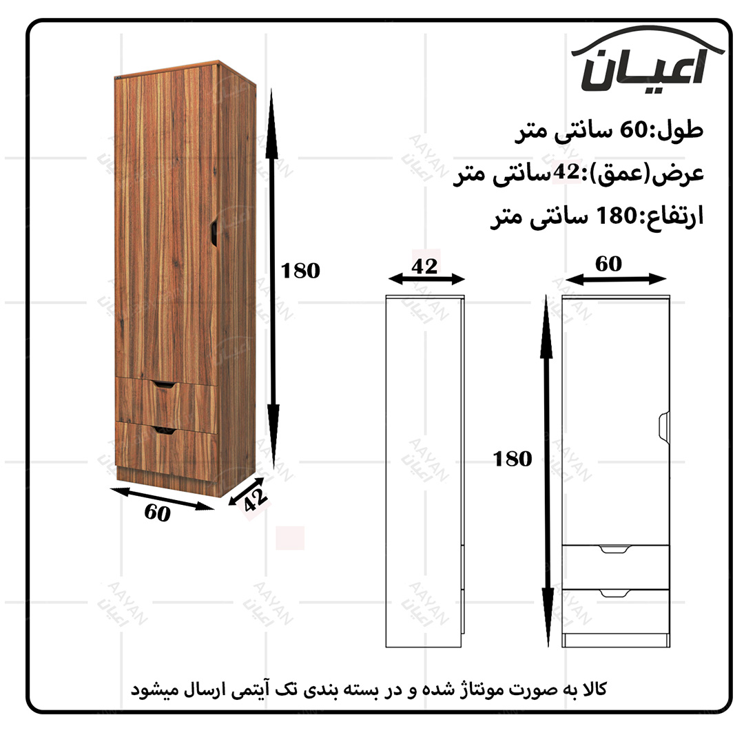 کمد لباس اعیان مدل FH488کمدلباس اعیان مدل FH488-محصولی چندمنظوره و کاربردی- مناسب برای فضاهای با ابعاد محدود-دارای فضای رگال کشویی – درب ها به صورت آرام بند- دارای 2کشوی ریلی جادار – جنس نئوپان ملامینه شرکتی – ورق پشت کار سه میل سفید – دستگیره ها به صورت سی ان سی- ابعاد کالا و رنگ بندی کار در تصاویر آلبوم و مشخصات موجود است