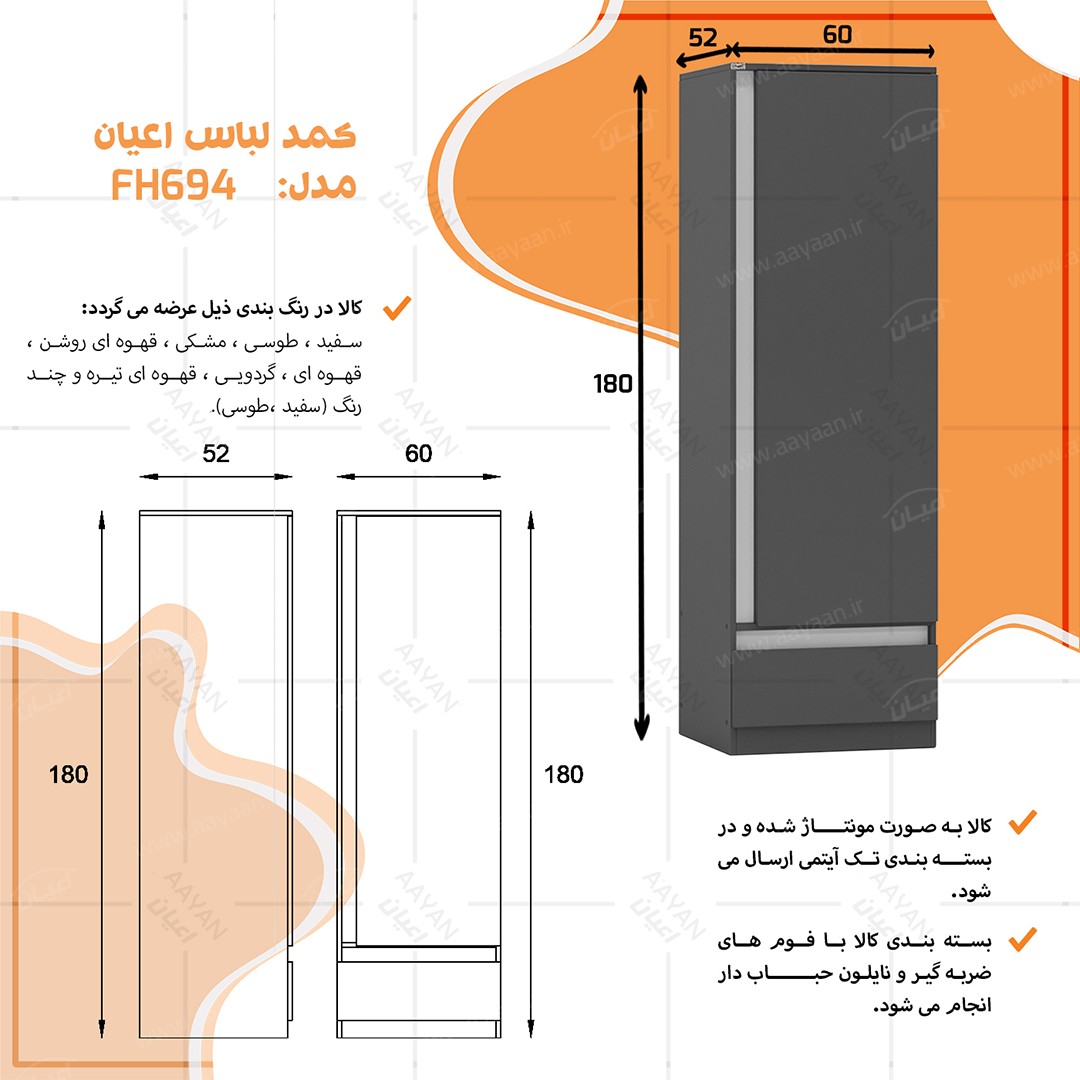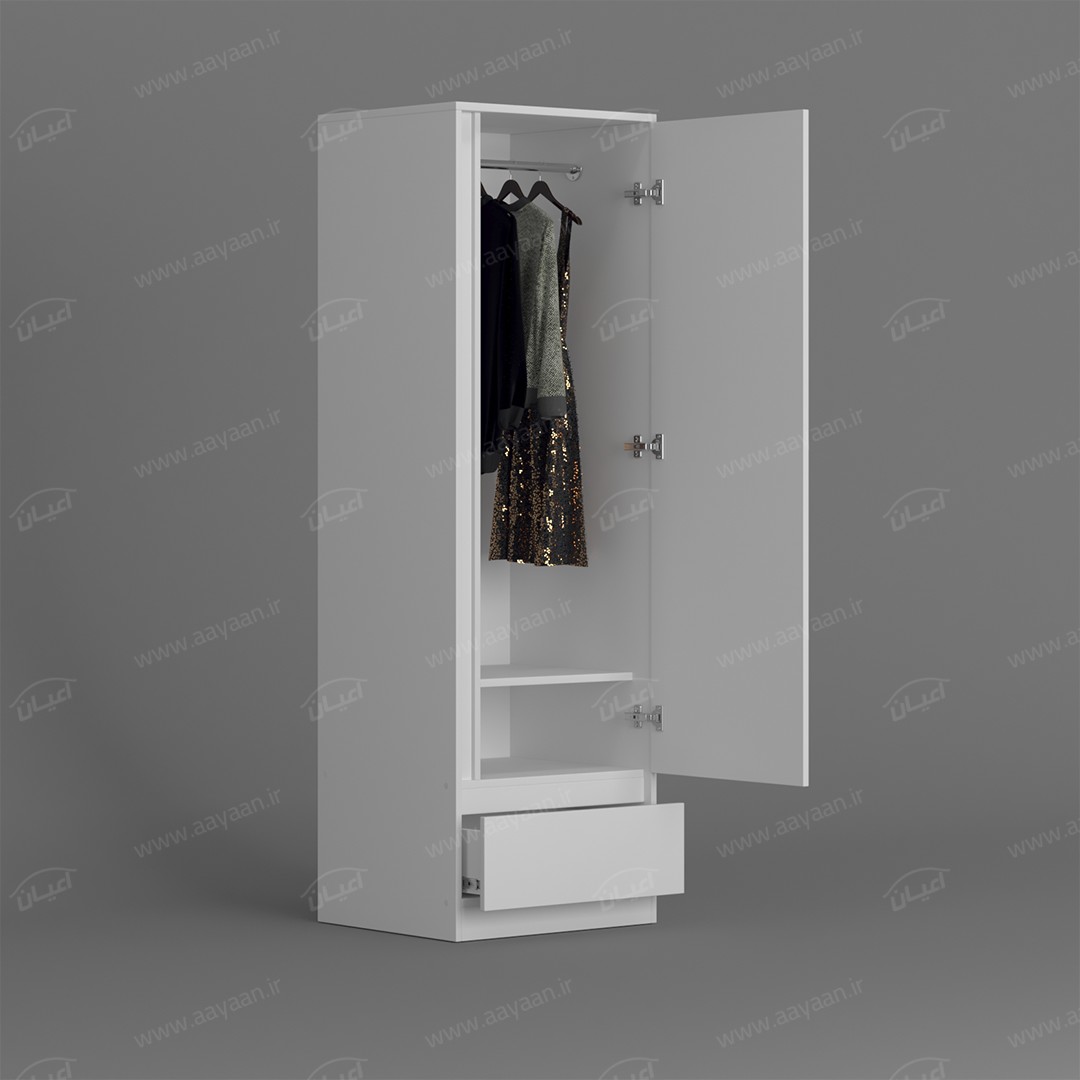 کمد لباس اعیان مدل FH694سطح ضدخش-طراحی ساده و کاربردی-دارای یک کشو بازشو و یک درب کمدی دارای فضای میله رگال و یک طبقه-دستگیره به صورت مخفی-درب به صورت آرامبند-بسته بندی کالا به صورت تک آیتمی است-کالاها به صورت مونتاژ شده ارسال می شود