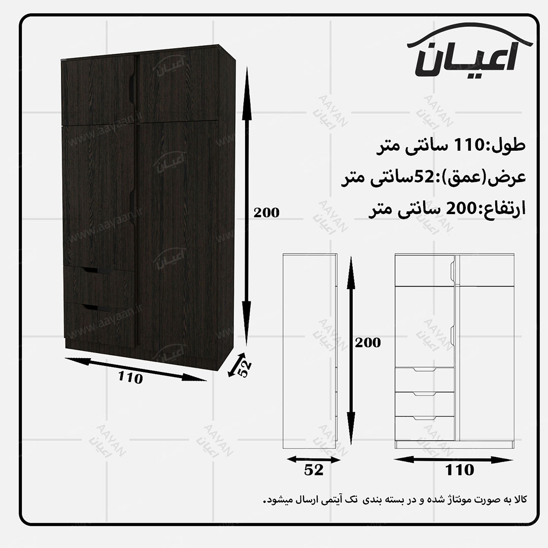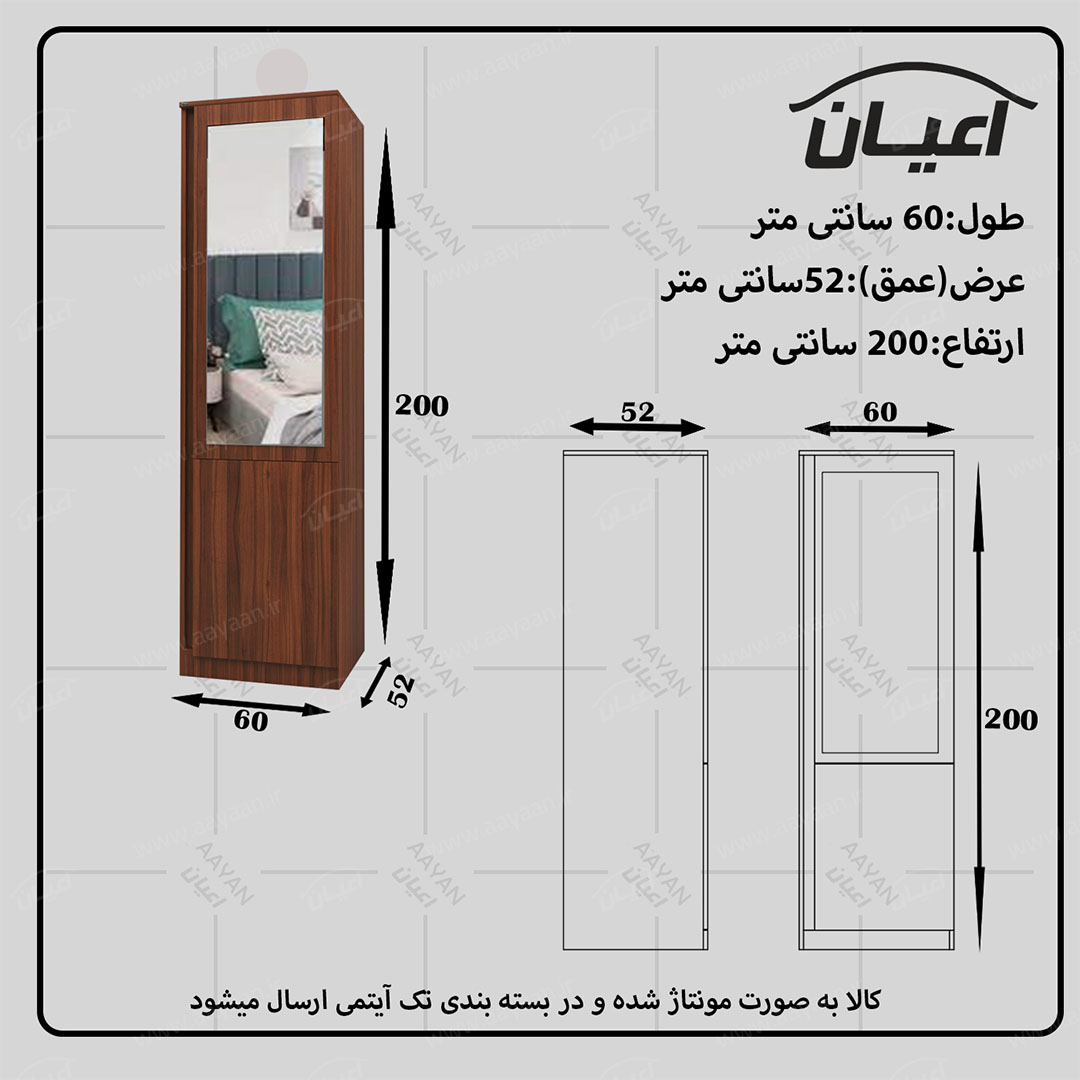 کمد لباس اعیان، جنس نئوپان ملامینه شرکتی شامل دو فضای کمدی، یک درب کمدی دارای میله رگال است بالای میله رگال دارای یک طبقه متحرک می باشد و یک درب کمدی دارای سه طبقه یک طبقه به صورت ثابت و دو طبقه به صورت متحرک می باشد.درب ها به صورت آرام بند می باشد.