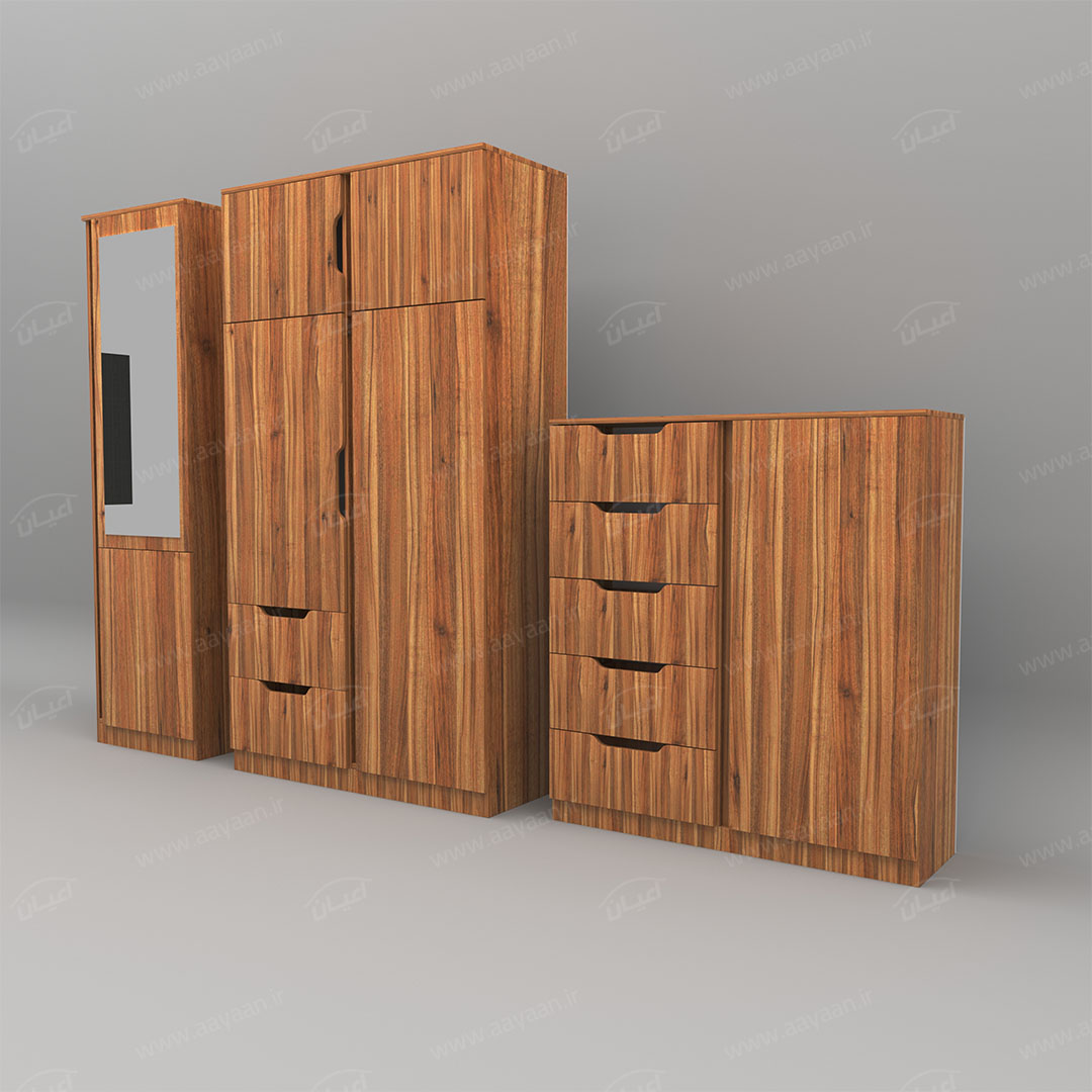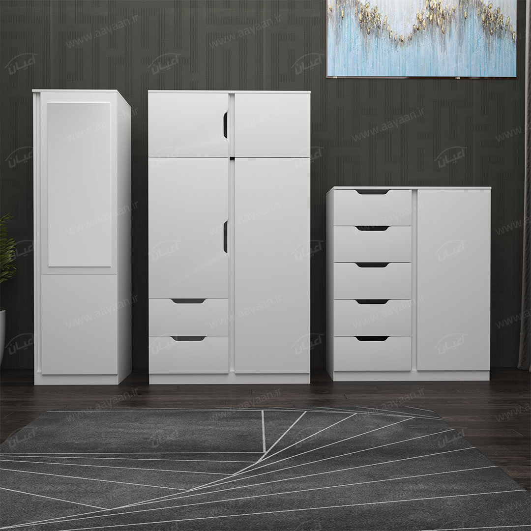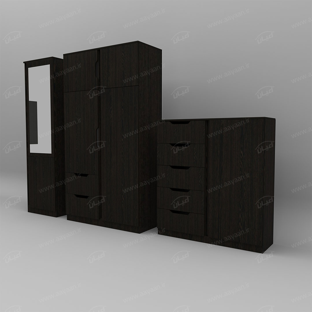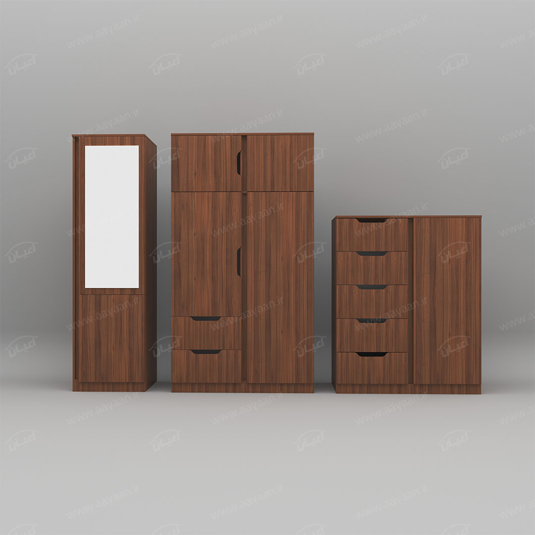 کمد لباس و دراور اعیان مدل FH571 مجموعه سه عددیکمد لباس اعیان، جنس نئوپان ملامینه شرکتی شامل چهار فضای کمدی، دو فضا دارای میله رگال است و همچنین دارای یک طبقه می باشد و دو درب کمدی در قسمت بالای فضای رگال می باشد.درب ها به صورت آرام بند می باشد و دارای دو کشو با ریل سه تکه – دستگیره ها به صورت جای دست و با CNC روی کار تعبیه شده است و فرمی مدرن را به کار داده است.