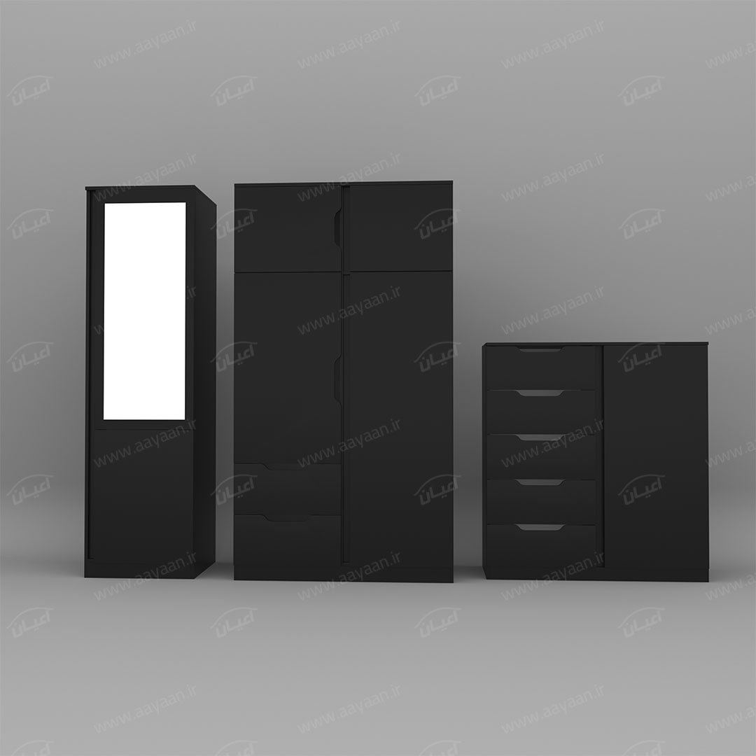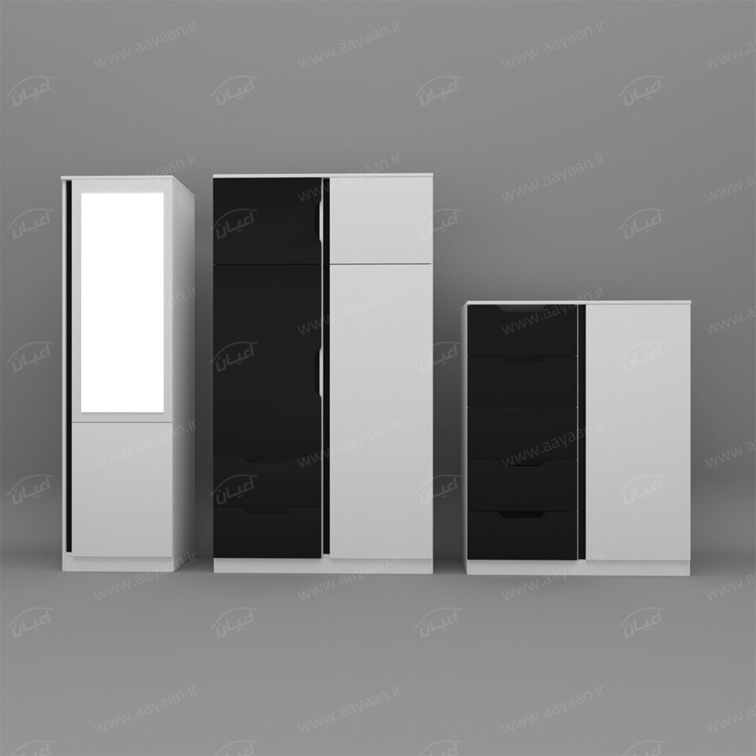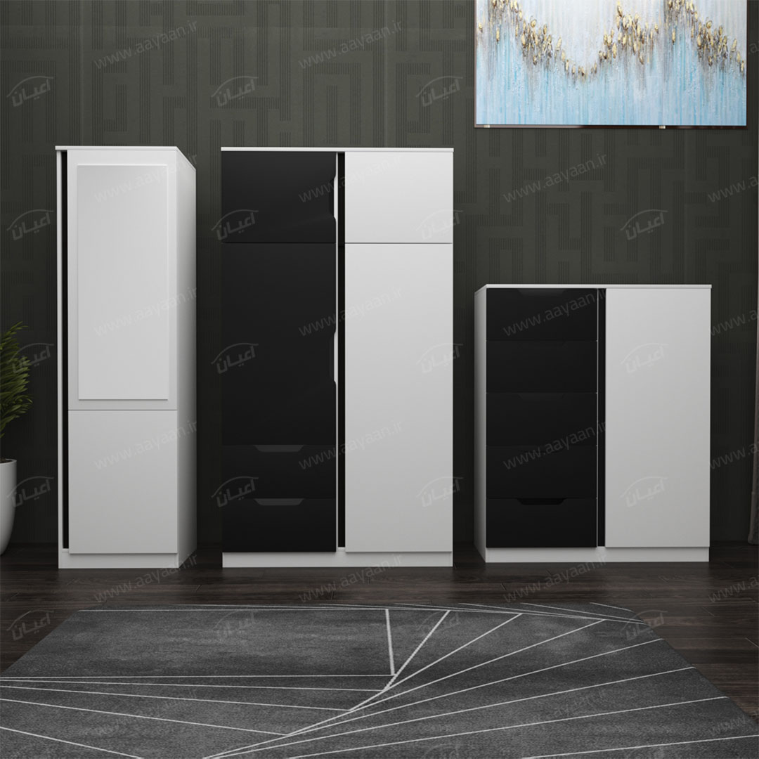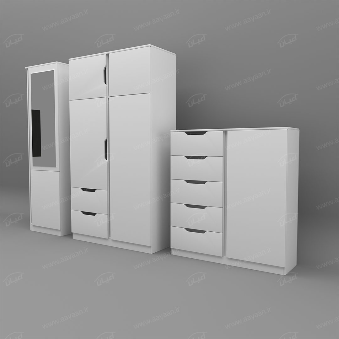 کمد لباس و دراور اعیان مدل FH571 مجموعه سه عددیکمد لباس اعیان، جنس نئوپان ملامینه شرکتی شامل چهار فضای کمدی، دو فضا دارای میله رگال است و همچنین دارای یک طبقه می باشد و دو درب کمدی در قسمت بالای فضای رگال می باشد.درب ها به صورت آرام بند می باشد و دارای دو کشو با ریل سه تکه – دستگیره ها به صورت جای دست و با CNC روی کار تعبیه شده است و فرمی مدرن را به کار داده است.