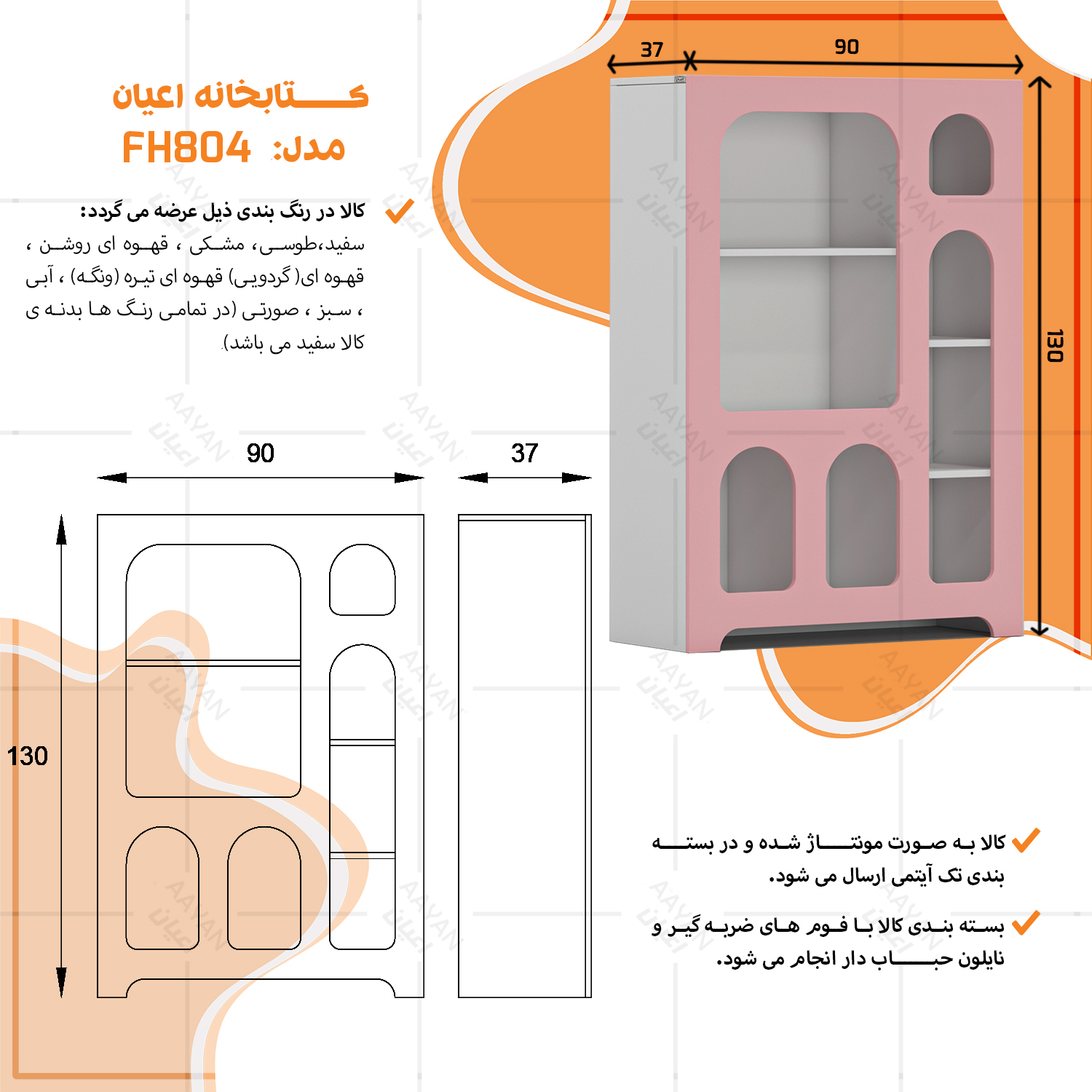 کتابخانه اعیان مدل FH804کتابخانه مدرن اعیان ، جنس بدنه مغزی نئوپان با روکش ملامینه ، جنس نما مغزی ام دی اف با روکش وکیوم ، دارای پنج طبقه با 8 فضای مجزا جهت قرار دادن کتاب و اکسسوری ، نما دارای طراحی CNC و منحنی های مینیمال و چشم نواز می باشد ، کالا به صورت مونتاژ شده ارسال می گردد و نیاز به نصب ندارد ، این محصول با رنگ بندی (سفید ، طوسی ، مشکی ، قهوه ای روشن ، قهوه ای (گردویی) ، قهوه ای تیره (ونگه) ، سبز ، آبی و صورتی) تولید و عرضه می شود (لطفا دقت فرمایید که در تمامی رنگ ها ، رنگ بدنه ی کالا سفید می باشد) ، این کالا را فقط با لوگو و برند اعیان تهیه کنید، در نظر داشته باشید که همواره چند درجه اختلاف رنگ بین تصاویر بارگذاری شده و کالای ساخته شده وجود دارد.